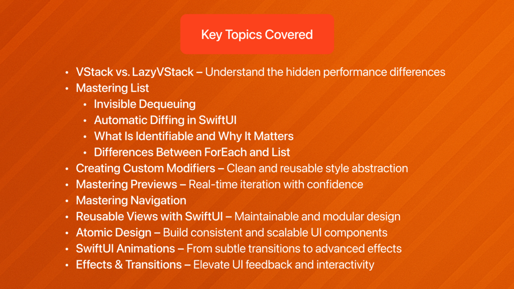 • Deep dives into animation, layout, state management, previews, accessibility, and more